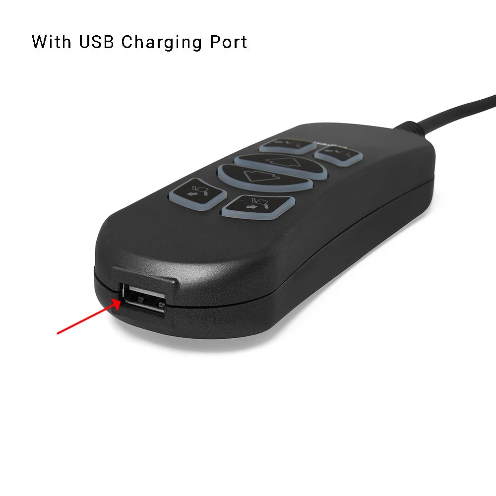 This 6-button remote controller uses a 7-pin round plug and is suitable for recliners and lifts with 3 pushrod motors. It can replace most of the HSW306 hand wands from HHC/MotorMotion.