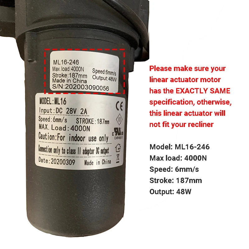 This Mulin linear actuator motor – Model number ML16-246 is meant for replacement purposes only. The Mulin ML16-246 is used on several Catnapper recliners/sofa/lift chairs, please refer to the following image, if your original linear actuator motor has the exact same specification as it, you can order this item to replace yours.